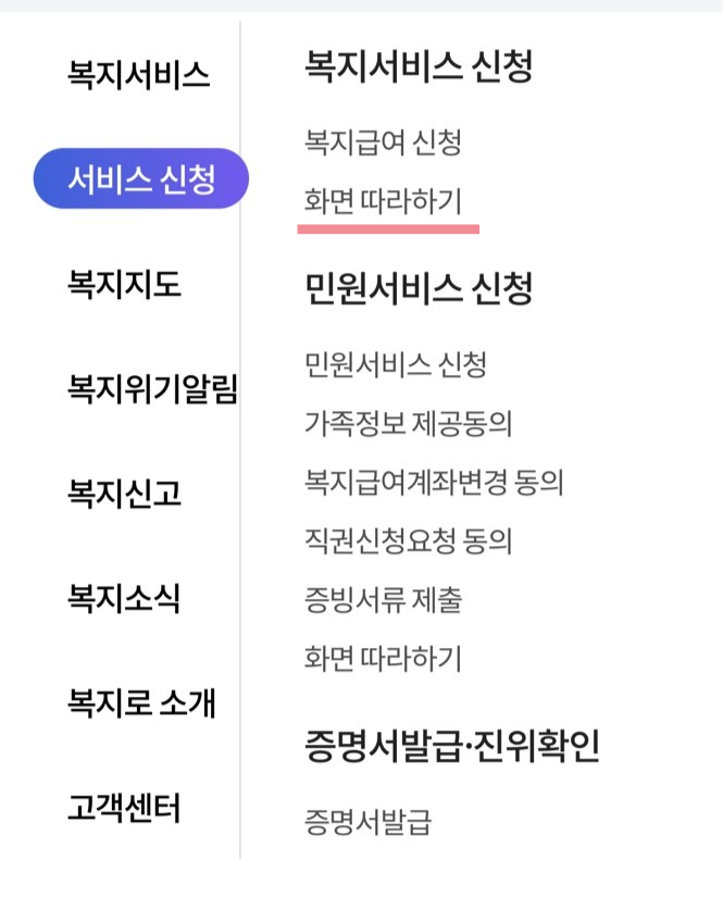 - 서비스 신청 탭에서 복지 서비스 신청을 보시면 두 번째 란에 화면 따라 하기 스텝이 있습니다.