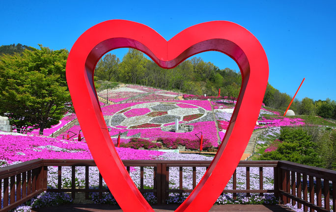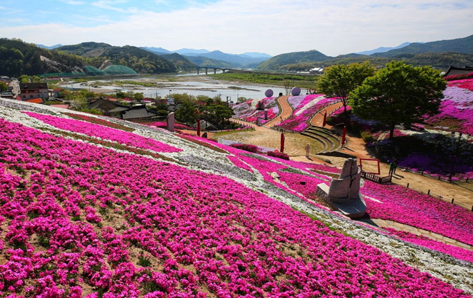 - 분홍 카펫 언덕길 – 꽃잔디가 깔린 언덕 위를 따라 산책로가 이어짐