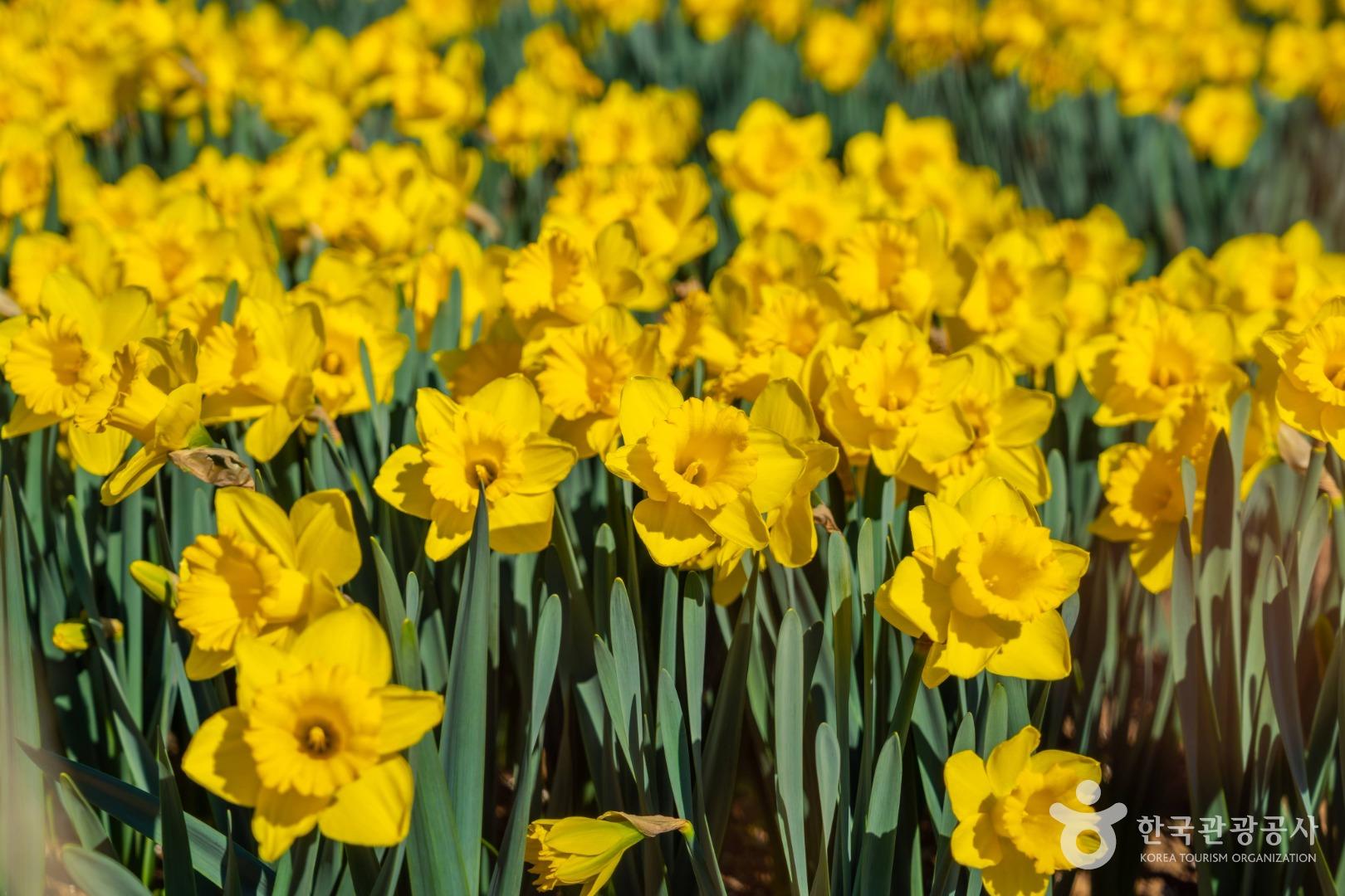 입구를 지나 조금만 걸으면 수선화 언덕이 펼쳐집니다. 노란 수선화 물결은 사진 촬영 필수 포인트입니다.