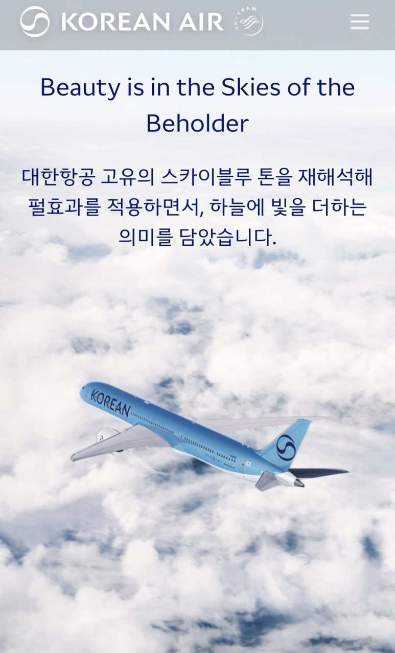 특히, 새 항공기 도장(리버리)에서는 'KOREAN AIR' 에서 'AIR'를 빼고, 'KOREAN'이 기체 측면에 큼지막하게 새겨졌습니다. 이는 미국 'American', 스위스 'Swiss', 오스트리아 'Austrian', 태국 'Thai'처럼 국적만을 강조한 글로벌 항공사의 트렌드를 반영하였다고 합니다.