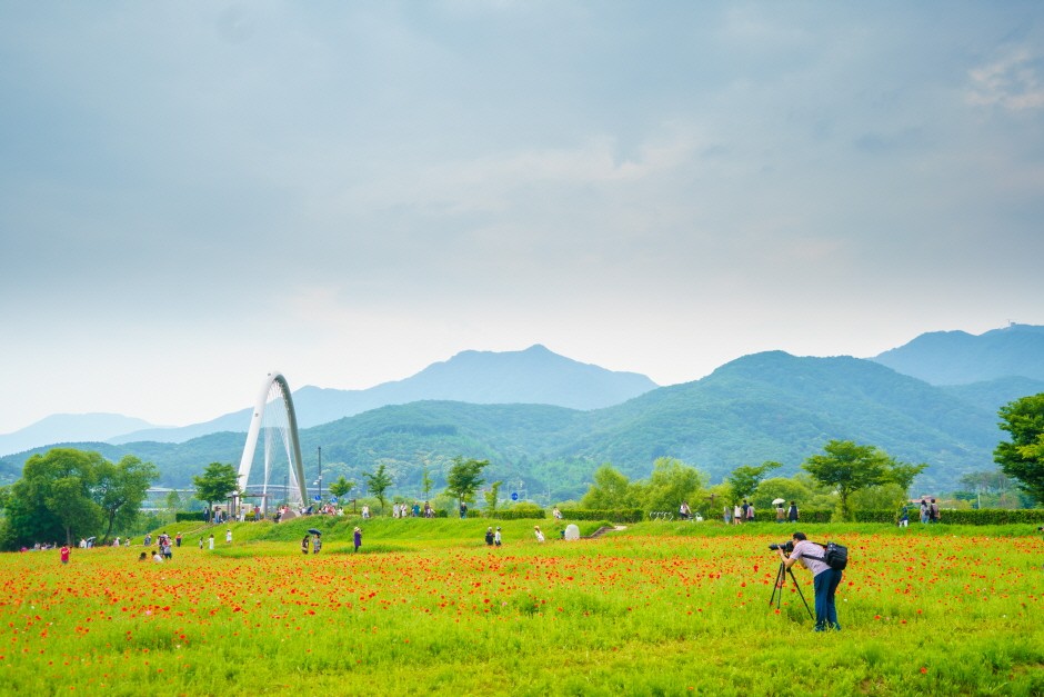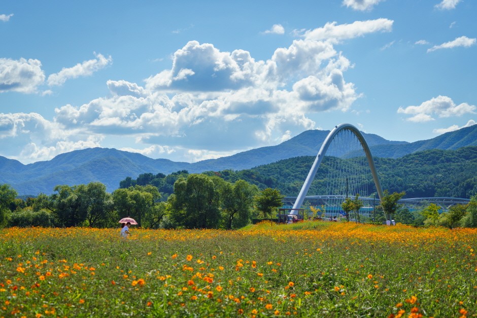 이 다리를 중심으로 좌우로 넓은 초화단지와 강변 산책로가 펼쳐져 있어, 산책을 하다가 다리를 건너면 마치 다른 세계로 들어선 듯한 느낌을 줍니다.