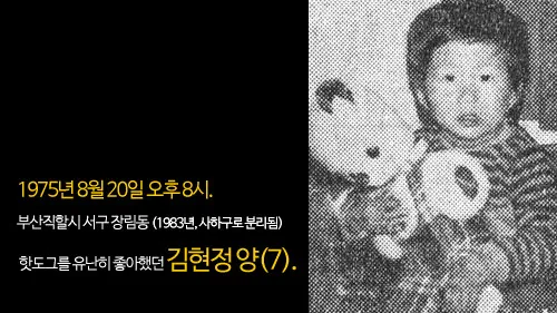1975년 8월 20일 저녁 8시, 부산 서구 장림동에 사는 7살 김현정 양은 늘 그랬듯이 핫도그를 사기 위해 집 근처 구멍가게로 나갔습니다. 하지만 돌아오지 않았고, 가족과 주민들의 수색에도 불구하고 그날 밤 아무런 소식도 없었습니다.