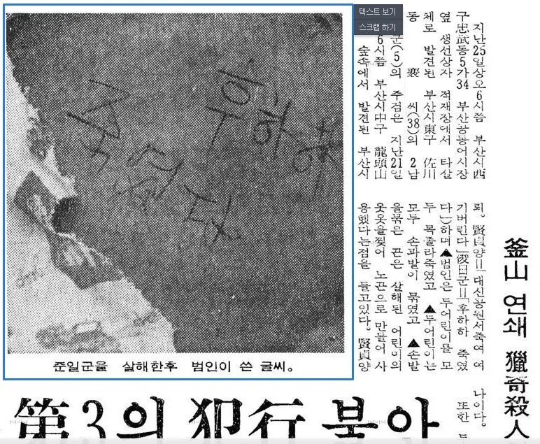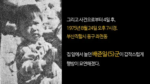 김현정 양 사건 발생 나흘 뒤인 8월 24일, 동구 좌천동에서 또 한 명의 아이가 실종됩니다. 5살 배준일 군은 집 앞에서 놀다 실종되었고, 다음 날 오전 6시, 충무동 부산공동어시장 근처에서 시신으로 발견됩니다. 손발이 결박된 채 생선상자 속에 숨겨져 있었으며, 배에도 사인펜으로 ‘후하하 죽였다’는 섬뜩한 낙서가 적혀 있었습니다.