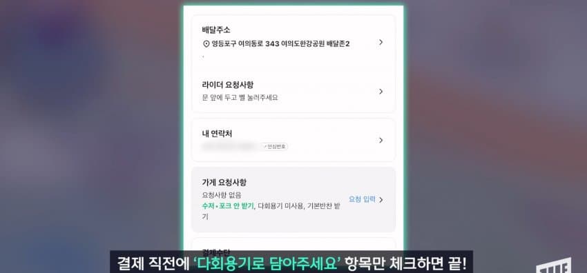 - 배달 앱 실행 → '간편한 다회용기' 선택
