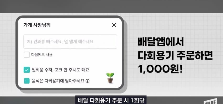 - 다회용기 옵션이 숨어 있는 구조의 앱 인터페이스