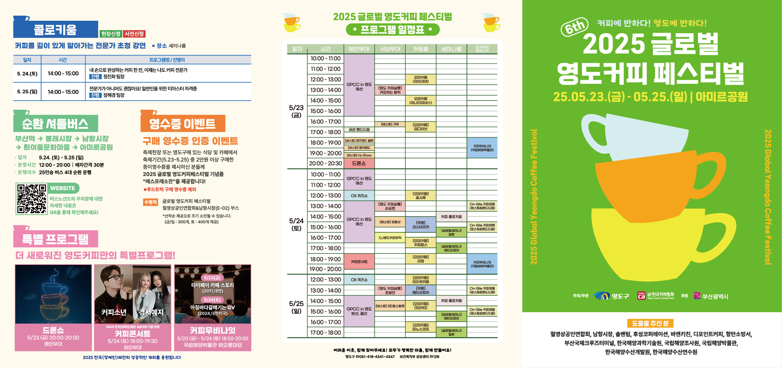 올해 영도커피페스티벌은 단순한 전시나 시음행사를 넘어, 커피를 매개로 한 문화와 글로벌 커뮤니케이션의 장이 될 예정입니다. 아래 주요 프로그램을 소개합니다.