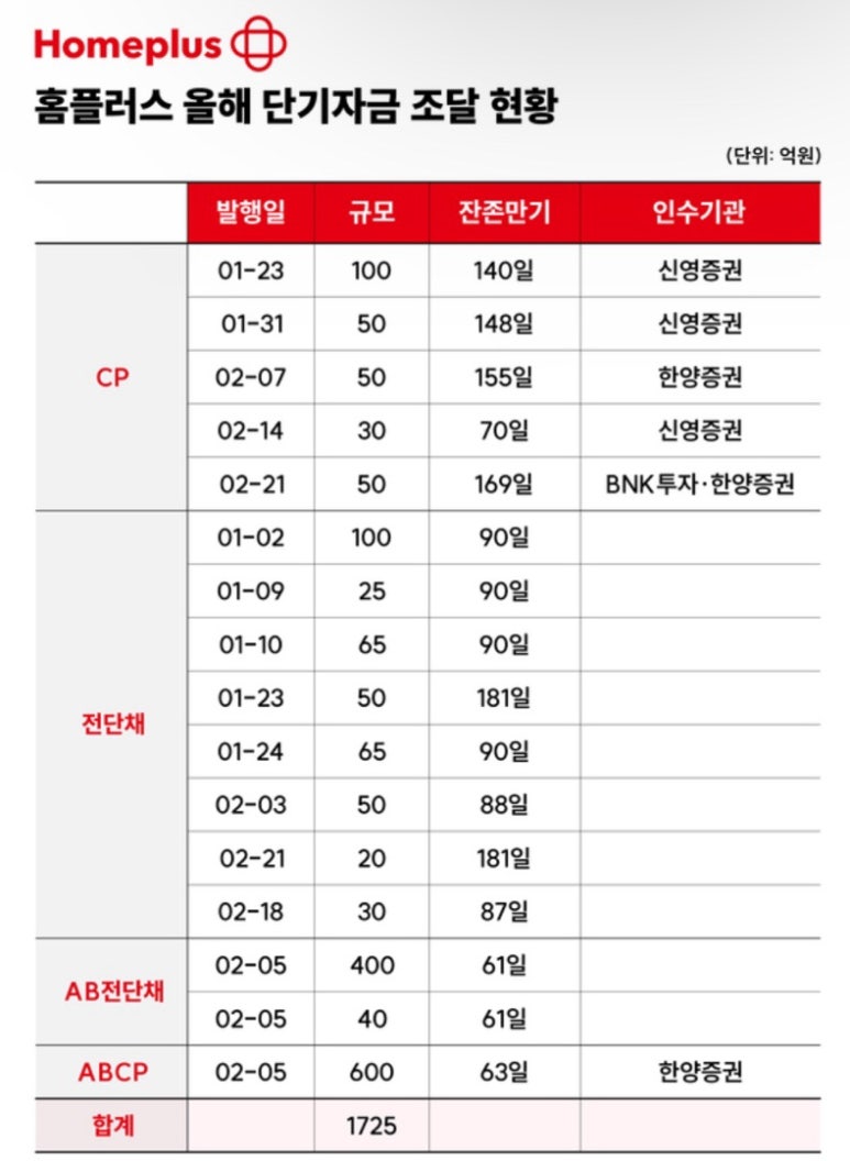 2024년 2분기 기준으로 홈플러스는 다양한 채권이 발행되었습니다. 특히, 단기채권의 발행 규모는 1,725억 원에 달합니다. 발행된 채권의 종류와 금액, 만기 기간, 인수 기관 등이 정리된 자료를 통해 홈플러스의 채권 단기채권으로 시작되었음을 알 수 있습니다. 홈플러스는 현재 기업 회생 절차를 진행 중이며, 이 과정에서 많은 투자자들이 불안해하고 있습니다.