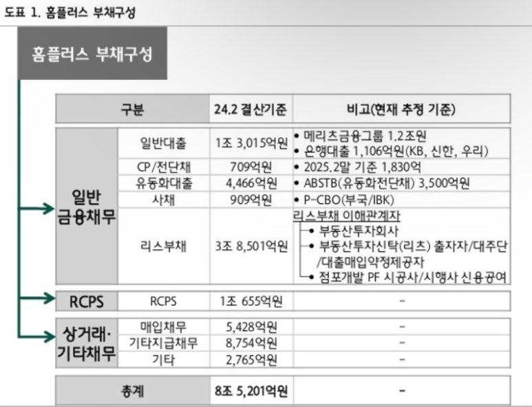 홈플러스의 재정 구조는 일반대출, 리스 부채, RCPS 등 다양한 금융 부채로 복잡하게 얽혀 있습니다.
