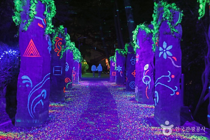 디지털 콘텐츠와 실시간 인터랙션 기술을 융합한 이곳은 어두운 숲길 위로 환상적인 빛과 영상이 어우러지며, 마치 동화 속 세계에 들어선 듯한 느낌을 줍니다. 특히, 기존의 남망산공원 숲길을 그대로 보존한 상태에서 조명과 테마 스토리를 입혔기 때문에 자연과 예술이 조화를 이루고 있는 것이 큰 매력입니다.