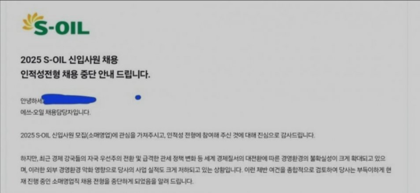 채용은 4월 20일까지 서류 접수를 받고, 5월 4일에는 인적성 검사를 실시하는 등 일정에 맞춰 차질 없이 진행되던 상황이었습니다. 이후 2차례 면접을 거쳐 7월 입사를 목표로 했던 과정이었지만, 에쓰오일은 6월 초 갑작스럽게 채용 절차를 전면 중단한다고 공식 발표하였습니다.