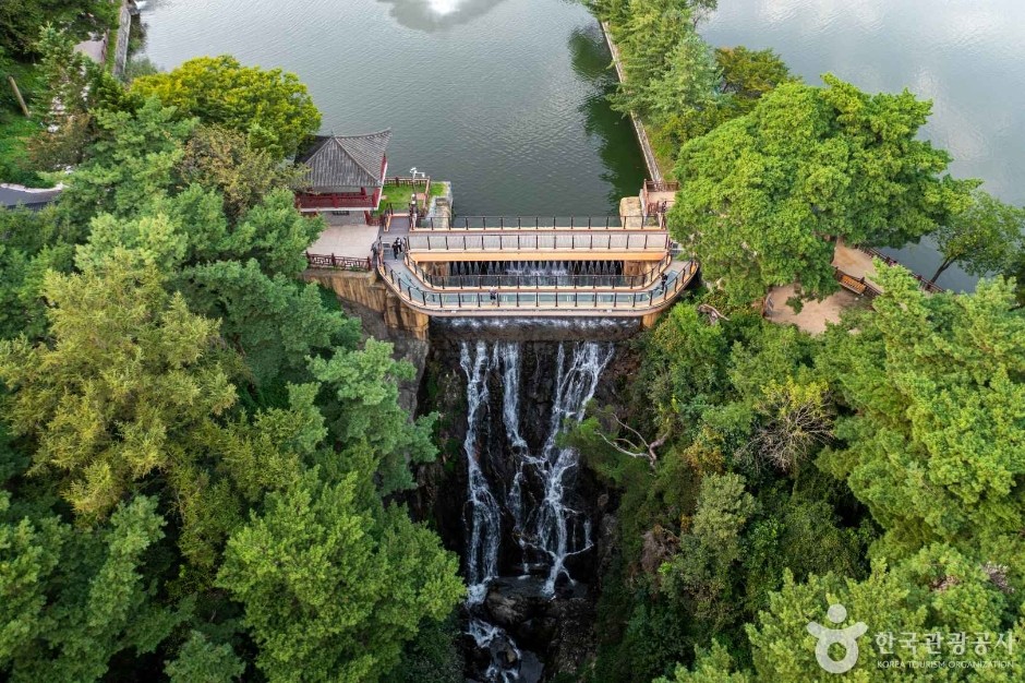용추폭포와 분수, 그리고 자연이 어우러진 풍경