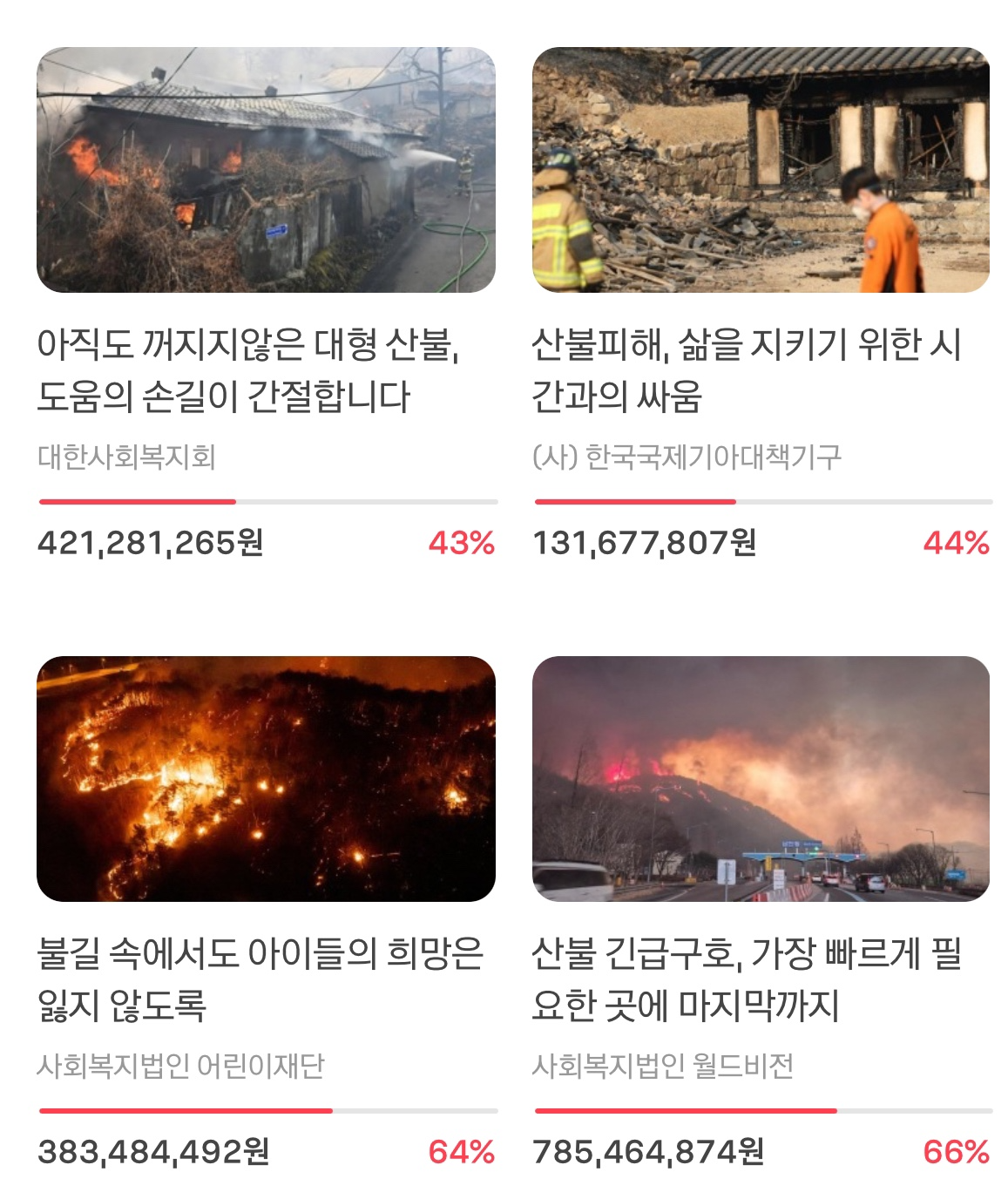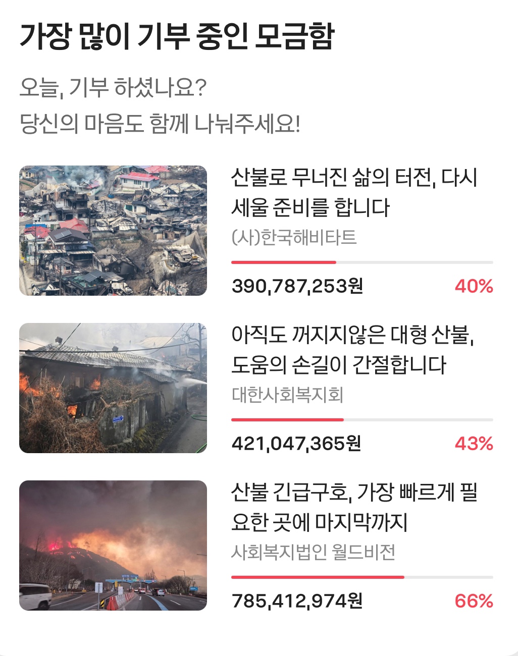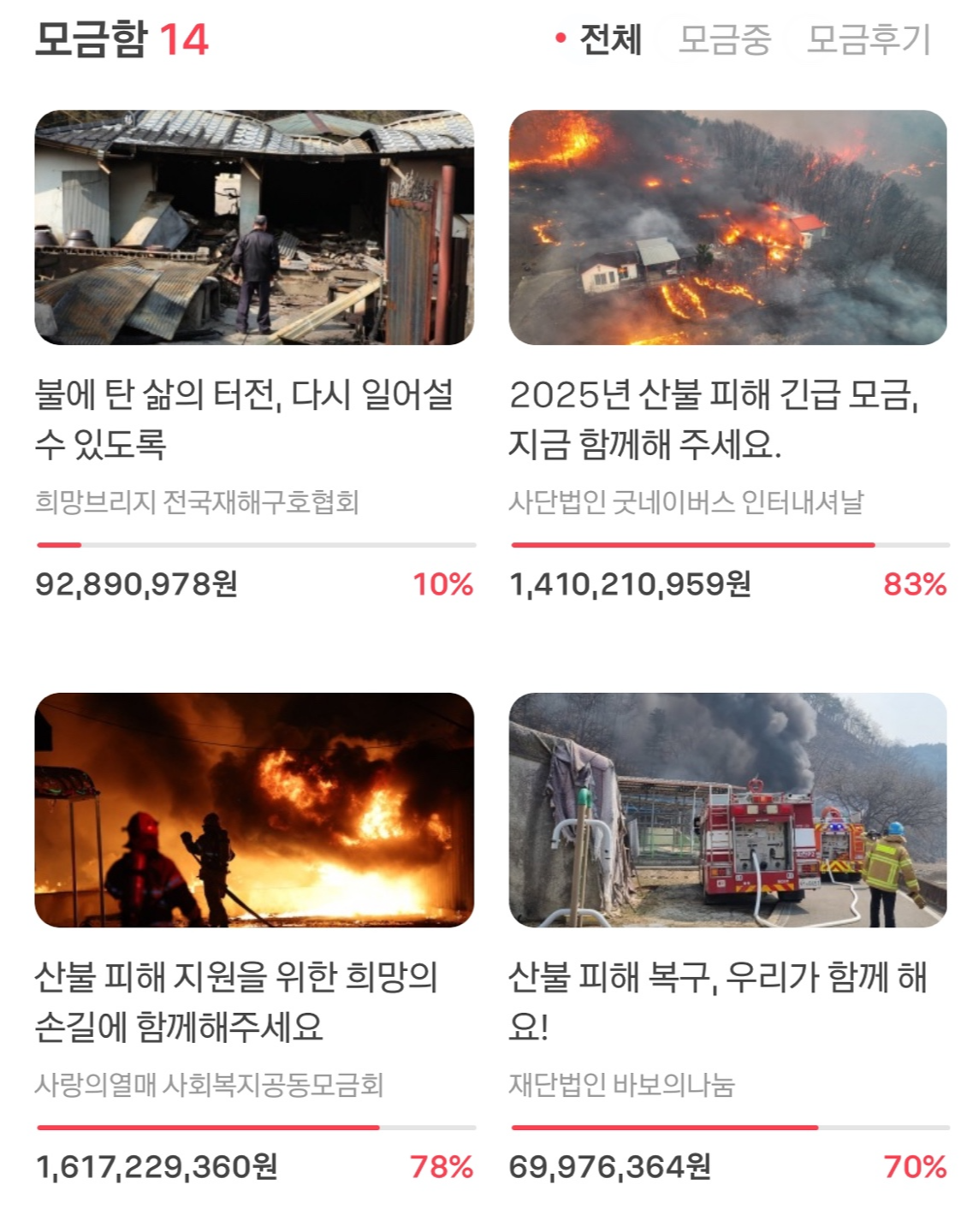 네이버는 '해피빈' & 카카오는 '같이가치' 는 온라인 플랫폼에서 여러 기관과 협력하여 산불 피해 복구를 위한 모금 활동을 진행하고 있습니다. 협력 기관으로는 전국재해구호협회, 사회복지공동모금회, 대한적십자사 등이 있습니다.