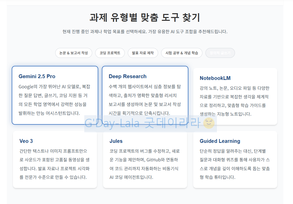 | Gemini 2.5 Pro | 질문 및 이미지 입력 지원, 복잡한 문제 해결 | 과제 해결, 에세이 초안 작성, 시험 준비, 복잡한 수학 문제 풀이, 논리적 주장 구성, 코딩 질문 답변 및 디버깅 |