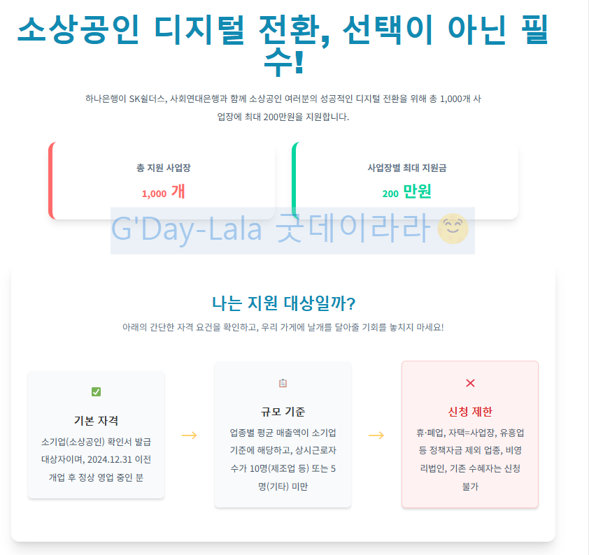 하나은행의 '디지털 전환 기기 지원 사업'은 엄격한 자격 요건을 통해 지원이 절실한 소상공인에게 혜택이 돌아갈 수 있도록 설계되었습니다. 이 사업의 지원 대상은 중소기업확인서 상 소기업(소상공인)으로 발급된 사업자입니다.