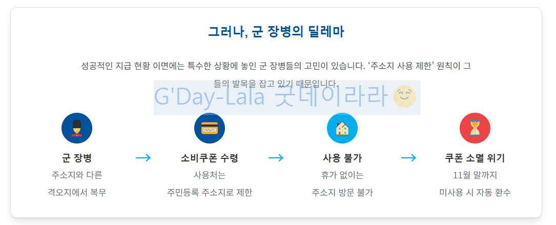 소비쿠폰의 '주소지 제한' 원칙은 일반 국민에게는 지역 경제 활성화라는 목적에 부합할 수 있습니다. 하지만 군 장병은 의무 복무로 인해 주소지와 실 거주지가 다른 경우가 대부분이며, 이동의 자유도 제한됩니다. 이러한 특수성을 간과한 정책 설계는 의도치 않게 군 장병을 정책의 사각지대에 놓이게 만들었습니다.