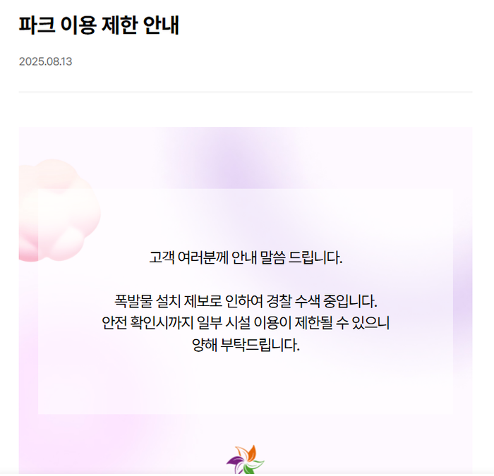 에버랜드 역시 상황의 심각성을 인지하고 고객들의 안전을 위해 발빠르게 움직였습니다. 공식 공지사항을 통해 "폭발물 설치 제보로 인해 경찰 수색 중"임을 알리고, 안전이 완전히 확인될 때까지 일부 시설 이용이 제한될 수 있음을 양해해 달라는 내용의 공지문을 게시했습니다.