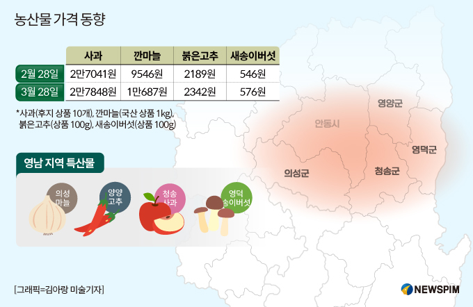 한국물가협회는 경북과 경남이 사과, 마늘, 양파 주산지로 밀집해 있다고 밝혔습니다. 이 지역들은 전국 생산량 기준 사과 73.2%, 마늘 49.0%, 양파 35.6%를 차지하고 있습니다. 대규모 산불과 이상 기후는 농업 기반에 직격탄이 되고 있으며, 해당 품목들의 수급 차질과 가격 상승세가 이어질 것으로 보입니다. 최근 사과(후지) 상품 10개의 소매가격은 한 달 전보다 2.98% 상승하였고, 국산 깐마늘 1kg 소매가격은 11.9% 높아졌습니다.