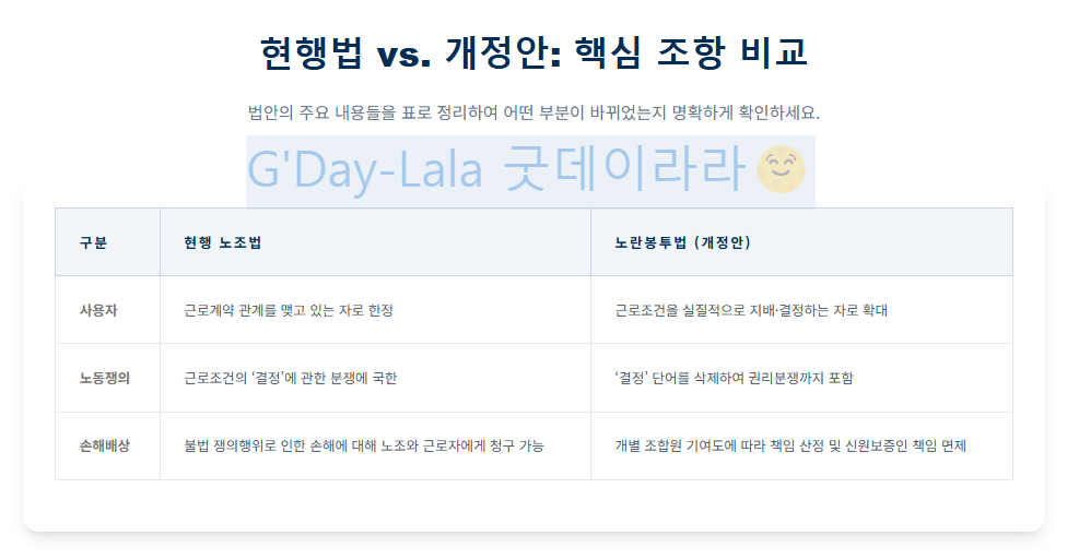 노란봉투법 (노동조합법 2·3조 개정안)의 국회 통과로 산업계가 요동치고 있습니다. 사용자의 범위가 원청까지 확대되고, 노동쟁의 대상 및 손해배상 청구가 제한되는 것이 핵심입니다. 현대제