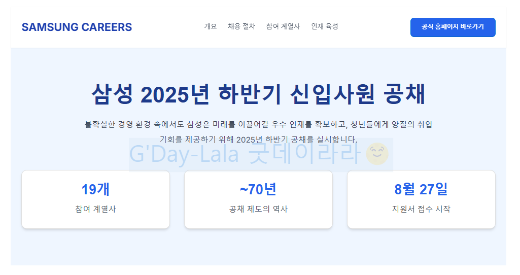 삼성 하반기 공채 완벽하게 준비하세요. 삼성전자, 삼성바이오로직스 등 19개 계열사 채용 정보와 GSAT, SW 역량 테스트, 면접 절차를 한눈에 정리했습니다. 삼성 커리어스 홈페이지에서 바로 지원