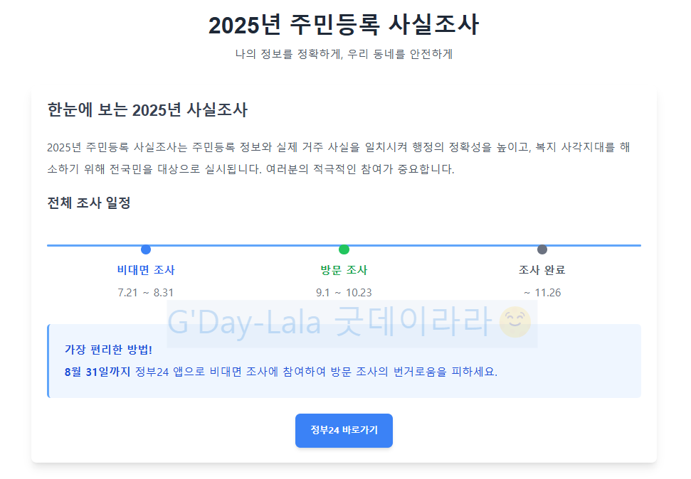 | 참여 방법 | 정부24 앱을 통한 비대면 디지털 조사 | 이·통장 또는 공무원의 직접 방문 |