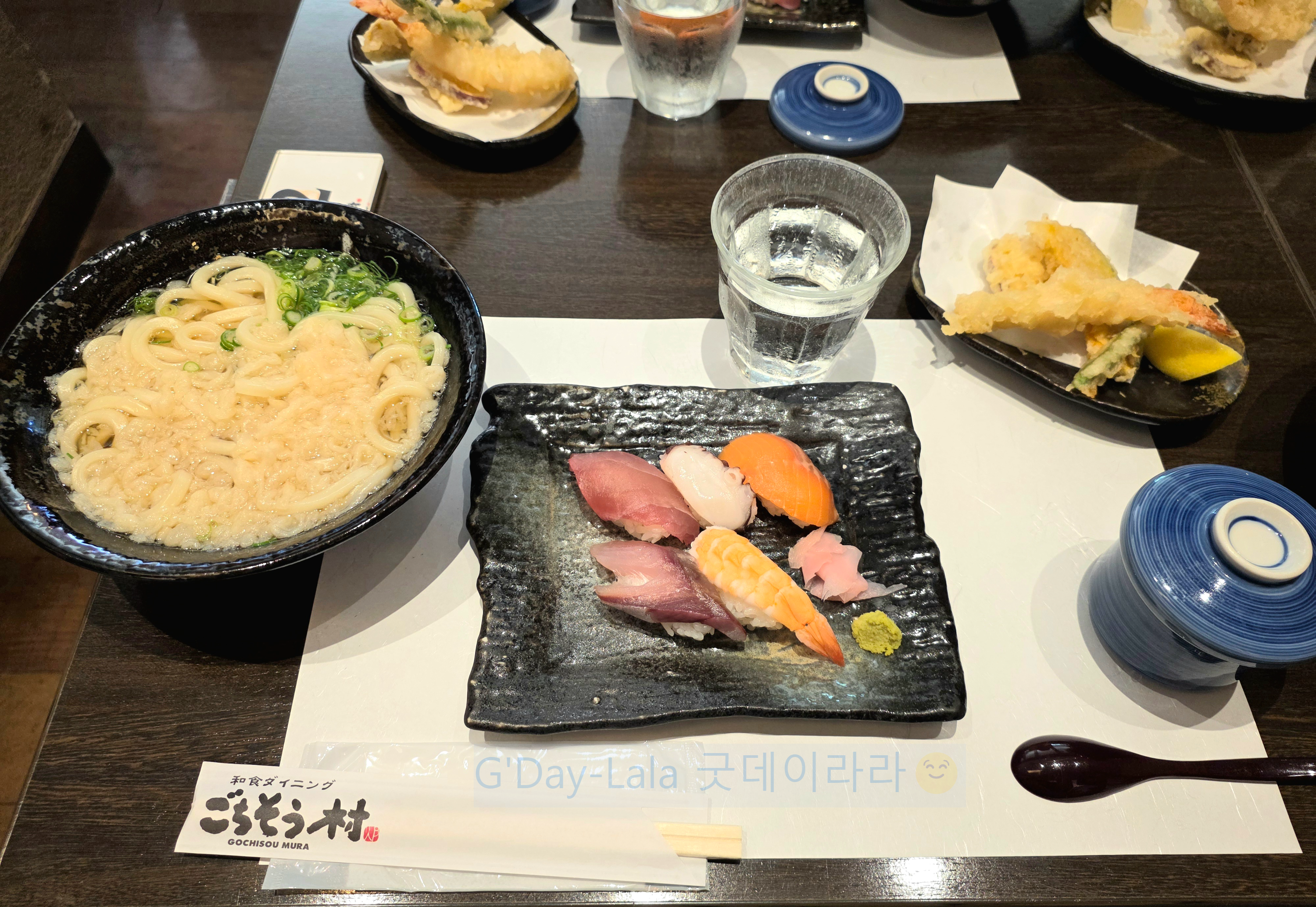 허기진 배를 채우러 근처 식당에서 우동과 스시로 첫 끼를 해결했습니다.