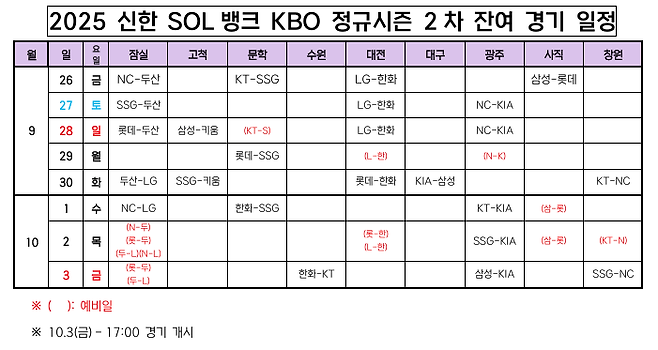 2025 KBO 정규시즌 마지막 퍼즐, 2차 잔여 경기 일정 사진 출처 인터넷 웹사이트