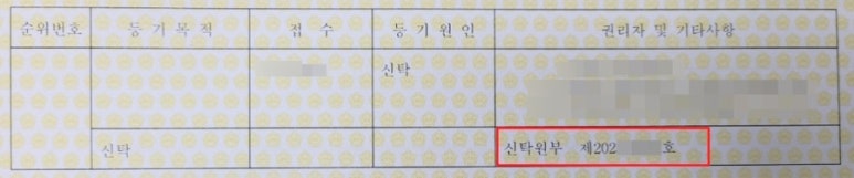 신탁 여부를 확인하기 위해서는 등기부등본을 발급받아 갑구(소유권 관련 사항)를 체크해야 합니다. 신탁이 있을 경우, 권리자 및 기타 사항에 신탁 내용이 기재되어 있습니다. 또한 신탁원부에서 권한이 누구에게 있는지 확인할 수 있습니다. 만약 신탁이 기재되어 있지만 빨간 줄이 그어져 있다면, 이는 해당 계약의 신탁이 말소되었음을 의미합니다.